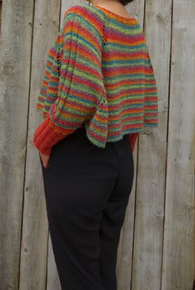 This raglan trapeze pullover features as opposed to sleeves, cuffs that join the bottom front and back hems. Worked top-down, in round for a seamless look, is easy to adjust for length, perfect for a selfstriping yarn.