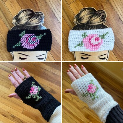 - You can use scrap yarn for the embroidery. One skein in White, Black and Pewter will make your headband and mitts.
