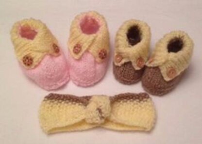 Baby Knitting Pattern Crossed Cuffed Shoes with matching Knotted Hairband