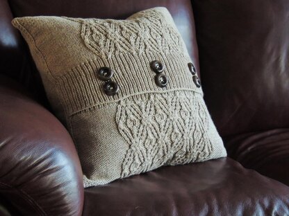 The Crossing Paths Cushion Cover features a wide button band with two parallel rows of buttons, as well as a stocking stitch side edge which is easy to finish and adds to a polished look. The cushion can be displayed with buttons front or back and is equally attractive either way. The design showcases an engaging stitch pattern from Annie Maloney's Lovely Stitches Volume 3: 37 Cables, against a reverse stocking stitch background. The cushion cover is knit in one piece and requires very little seaming.