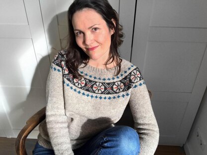 This garment is knit seamlessly from the top down, featuring a stranded colorwork section around the yoke. The yoke is a hybrid circular/raglan for an optimal fit. The pattern also gives the option to work a few short rows at the back neck for a more fitted neckline. The yoke is worked in the round to the underarms, then the sleeves are put on hold, and the body is worked in the round to the hem, with a slight A-line shape. Lastly, the sleeve stitches are returned to the needles and worked in the round to the cuff. Please note: the colorwork portions are charted only. One round in the colorwork section requires three-color stranding (the rest uses two-color stranding)