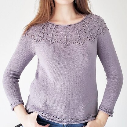 Made of silk and baby alpaca yarn this lace yoke sweater is designed to emphasize feminine allure. The body and sleeves are knit in the round from the bottom up. The body has some positive ease while the sleeves are more fitted. The back neck is shaped with short-rows so the sweater fit comfortable.