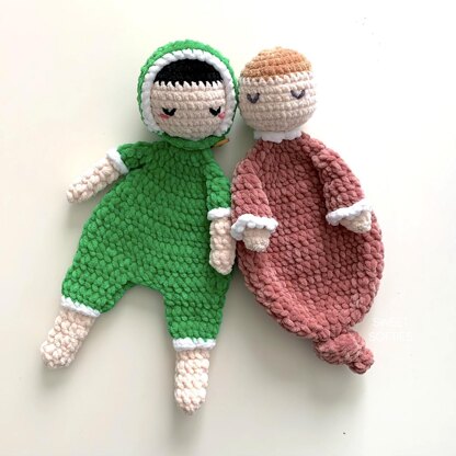 The Cuddle Baby Ragdoll Lovey is a cuddler toy that has a flat body, mimicking a security blanket for babies, toddlers, and young children. This no-sew pattern bundle contains multiple options to customize the perfect doll, including: body shape, sleeve length, and edging. There are two main body shapes to choose from: a swaddled baby (wearing a gown with a knot at the bottom), and a pajama baby (with legs showing). You may opt for short or long sleeve lengths. Edging can be lacy (for a more feminine look) or straight (for a unisex/gender neutral look) on the neck, sleeve cuffs, and optional pant cuffs. Lastly, the pattern includes a removable bonnet. This snuggler works up quickly and easily with blanket yarn or super bulky chenille velvet yarn. It makes the perfect heirloom keepsake gift for babies, toddlers, and both boys and girls. Crochet it for craft fairs or markets, as a birthday gift, holiday gift, or baby shower gift!