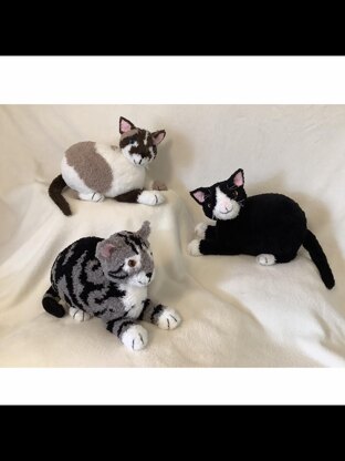 This pattern is for a soft cuddly cat with a choice of three different colour options. The cats are life size and so easy to sit on your knee to pet and cuddle. Ideal for pet lovers, children over 3 years of age, teenagers and adults. There are three skill levels. Jessie, the Basic black and white cat, is the easiest to make, Katie, the cream and beige cat, is a little more difficult because of the colour changes and Lulu, the striped cat, is the most difficult because of the striped colour changes. You will need 4mm needles, a ball of each colour of Truffle yarn used in the individual cat instructions and a small amount of pink and black DK for the ears, face and paw detail. Toy stuffing and a pair of 15mm cat safety eyes. Also a little white sewing thread and PVA glue for the whiskers. Measurements excluding tail, approximately 28cm long, 22cm high and 18cm wide.