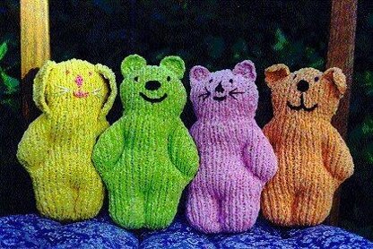 Yarn Notes: You can use any yarn you choose (the softer the better) with a needle 2 or 3 sizes smaller than is recommended for that yarn, so the knitting is firm. The toys may be larger or smaller depending upon your choice, but the bodies will remain in proportion. It is not necessary to match the gauge if you use a different weight of yarn.