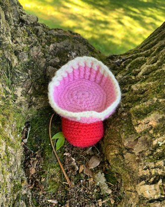 Using Plymouth Yarn Encore in several colors create this beautiful cupped coral mushroom. Based off of the real coral mushroom this is the the perfect summertime plush design for any mushroom lover. The techniques used in this pattern make this pattern sutible for the advanced intermediate crocheter. Use post stitches and color change techniques to create the texture in the cup.