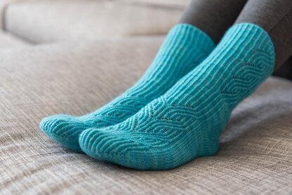 Alice’s curiosity leads to quite an adventure as she makes her way down the rabbit hole. These socks are an adventure of their own, with simple techniques that lead to unexpected results. Beginning at the toe, twisted rib stitches work their way up the foot of the sock. Decreases in pattern paired with yarnovers create unexpected winding pathways and lace that curiously resemble the eyes appearing in the forest that Alice encounters. Twisted rib continues up the leg of the sock, where the lace pattern shifts to the sides of the sock leg. Worked in Tanis Fiber Arts ‘Seabreeze,’ this design highlights the tonal qualities of the yarn and uses predictable lace patterns to create an easy-to-work sock with dramatic impact.