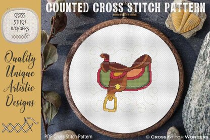 A great Curly Saddle Design.\nOriginal licensed artwork by Clipartopolis.\nCross Stitch Pattern designed by Marcia Manning.\n80 stitches wide by 80 stitches high.\nPDF is a COLOR counted cross stitch chart which lists suggested DMC floss colors, and includes a color picture.\nStitched design size is as follows: \nSize 14 count: 5.71 x 5.71 inches or 14.51 x 14.51 cm\nSize 16 count: 5.00 x 5.00 inches or 12.70 x 12.70 cm\nSize 18 count: 4.44 x 4.44 inches or 11.29 x 11.29 cm\nSize 22 count: 3.64 x 3.64 inches or 9.24 x 9.24 cm
