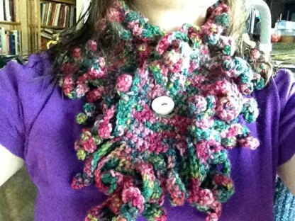 A simple neck warmer with fringe along the edges and a button closure. The pattern was designed to use only one skein of 5oz skein of Red Heart or other acrylic yarn.