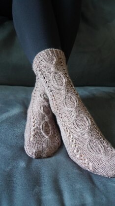 The socks use a short row heel technique for the heel and decreases for the toe. The cable panel is made with twisted stitches, lace, and cabling so you should know how to perform these techniques.