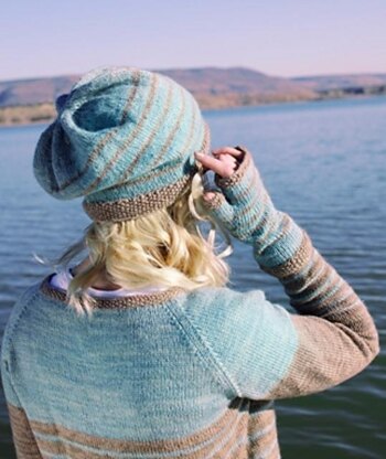 A simple striped accessory set. The mittens feature a contrast-color seed-stitch cuff and contrast color stripes. They have gusset thumb shaping. The slouch-style hat has a contrast color seed-stitch brim, with contrast color stripes and an easy-wearing casual fit. Note that instructions for BOTH the mittens and hat are included in this single pattern.