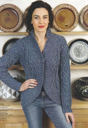 This is a pattern for a Curved Edge Jacket, originally published in Knitting magazine. It has a cable pattern, rib edges with a curved bottom front edge, one button. Photos Laurel Guilfoyle for Knitting magazine.