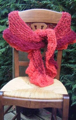 This wrap is an eliptical double-stranded scarf with options for a single or double frill. The wrap is cast on at the frilled edge and knit back and forth on a circular needle. Frills are created with k2tog decreases and grafted together in layers (double frill version). Shaping is achieved using short rows.