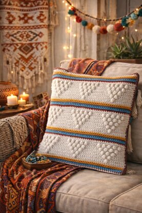 I have finished this cushion cover in a 12 ply cotton with a stitch tension of 13 stitches x 16 rows (10 x 10 cm sq). Any 10 or 12 ply or chunky cotton or cotton blend yarn would work well for this project.