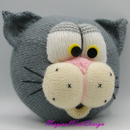 Cushion Tom, a lovely cushion for adults, kids and babies, to decorate sofa, kids bedrooms and nurses, knitted using 2 straight knitting needles, easy to follow pattern, with row by row written instructions and photo-tutorial.