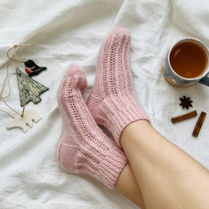 Pattern in English, US knitting terms The socks is worked top down in Stockinette stitch and lace pattern. Skills: knit, purl I used circular needles 80 cm long. But you can easily adapt it to set 4 Double Pointed Needles Pattern include with more yarn suggestions. Pattern comes with more yarn suggestions (Pattern includes linked shopping list). You can use any yarn close to parameters. The pattern includes step-by-step instructions, video tutorials for each step, and many lace pattern chart. This pattern includes video demonstration of the pattern. There are no spoken words in the video, and the directions are all shown in captions. This pattern contains links and QR-codes to video tutorials. Use your smartphone camera to scan the QR-code to view the video tutorials. This is useful if you are printing instructions. The pattern includes three sizes (S-XS, M-L, XL-XXL). Picture sizes XS-S/ Model size XS Easy to adjust foot length to fit your size.