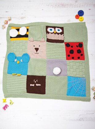 For this blanket, each square is knitted separately and then sewn together; the border is knitted in 4 lengths and then attached. The accessories for each animal are knitted separately and then sewn on.