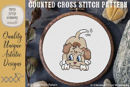 What a fun and cute Puppy / Dog Design!\nOriginal licensed artwork by Clipartopolis.\nCross Stitch Pattern designed by Marcia Manning.\n62 stitches wide by 80 stitches high.\nPDF is a COLOR counted cross stitch chart which lists suggested DMC floss colors, and includes a color picture.\nStitched design size is as follows: \nSize 14 count: 4.43 x 5.71 inches or 11.25 x 14.51 cm\nSize 16 count: 3.88 x 5.00 inches or 9.84 x 12.70 cm\nSize 18 count: 3.44 x 4.44 inches or 8.75 x 11.29 cm\nSize 22 count: 2.82 x 3.64 inches or 7.16 x 9.24 cm