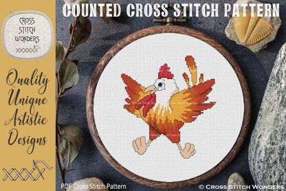 An adorable Cute Rooster Design.\nOriginal licensed artwork by Clipartopolis.\nCross Stitch Pattern designed by Marcia Manning.\n74 stitches wide by 80 stitches high.\nPDF is a COLOR counted cross stitch chart which lists suggested DMC floss colors, and includes a color picture.\nStitched design size is as follows: \nSize 14 count: 5.29 x 5.71 inches or 13.43 x 14.51 cm\nSize 16 count: 4.63 x 5.00 inches or 11.75 x 12.70 cm\nSize 18 count: 4.11 x 4.44 inches or 10.44 x 11.29 cm\nSize 22 count: 3.36 x 3.64 inches or 8.54 x 9.24 cm