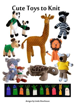 Cute Toys to Knit 1 includes: Lenny the lion - 8 inches tall Panda & cub with bamboo leaf sleeping bag - 5.5 and 8.5 inches tall Cat & mouse - 6 inches tall Giraffe - 19 inches tall Tommy Turtle - 10 inches long Pocket dog - 5 inches tall Jack Russell Terrier - 8.5 inches tall Zebra - 8.5 inches tall Vegetable finger puppets