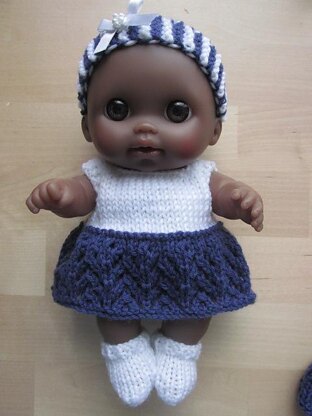 Very easy to make outfit for a Li'l Cutesies doll. Dress with lace pattern skirt, striped headband, panties and socks. Worked with DK yarn and straight 3mm needles. The socks are worked on 2.75mm straight needles. Can be made in a couple of evenings.