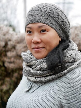 This slouchy tam in three sizes takes advantage of the combined assets in a luxury yarn blend—fine, bouncy wool provides body, warmth, and shape, while a silky fiber contributes lovely drape and sheen, with next-to-the-skin softness. The asymmetrical garter stitch brim can be folded up or worn down over one ear; the top is a swirl of pretty, easy to work patterns that make this project a great traveler and a beautiful gift.