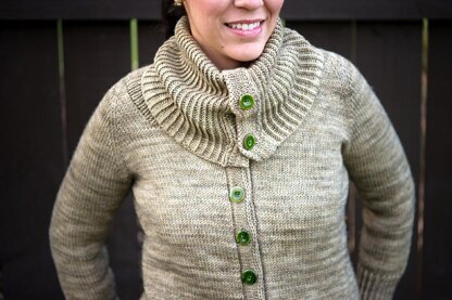 A simple cardigan is perennially wearable. In Cynthia’s Cardigan, a deep cowl that can be worn up or down tops a tailored shape, while a double-knitted buttonband adds a polished touch.