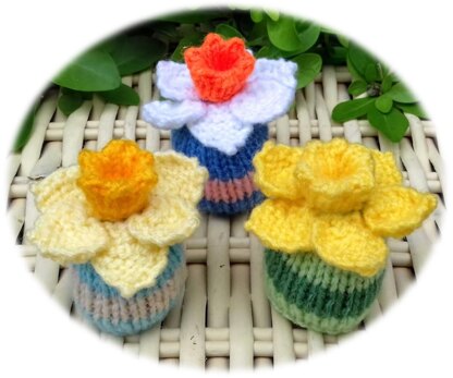 These pretty egg-shaped cameos are topped with a daffodil decoration, and each one holds a real chocolate Easter egg! They make gorgeous Springtime gifts. Each cameo is knitted in two colours of your choice – a background and a border colour – and you can knit a whole host of different daffodils to complement those colours. Only scraps of DK yarn are used. The pattern is very easy to follow so everyone can produce a dazzling daffodil!