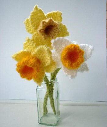 These daffodils are quick and simple to knit using oddments of DK yarn.(9 yards for petals, 6 yards for trumpet and 3 yards for stalk) They are the size of a real daffodil when knit with the suggested yarn and needles. Use a different shade of yellow for the trumpet to add variety or knit the petals in white to make narcissus. The stalks are supported with craft wire or pipe cleaners, but please omit the wire if they are to be handled by young children. Your daffodils will look very sweet in a small vase but you could shorten the stalk and add a pin back to make an eye catching brooch. You could also knit just the heads and attach to serviette holders, spring wreaths or gift tag.