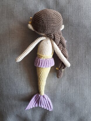 MATERIALS I used DROPS Muskat 50gr/100m DK yarn in cream for skin, coral, salmon pink and LA MIA COTTONY XL ice blue for hair, DROPS Glitter silver for fin, black thread to embroider eyes. hook 3 mm black safety eyes 9 mm fiberfill tapestry needle scissors pins stitch markers