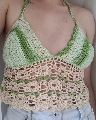 This pattern is made to measure, but also has a guideline based on a size chart (for the cups). The completed top is backless with a lacey front coverage. The top will be secured with two ties (one around the neck and one around the back). The pattern is easily adjustable and very comfortable for summer and/or going out. This pattern is beginner friendly :) Time to complete: approx. 3-4 hours