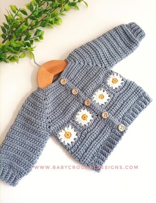 This cute little Cardigan is made from the top down using a simple hdc, then adding a row of daisy granny squares (or plain granny squares can also be used, pattern included) and a rib edging.