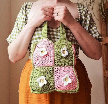 2020s does 60s does 90s! A mini boxy handbag made from simple floral blocks with a checkerboard effect. It’ll be a spring /summer staple for your cottagecore wardrobe. The three-dimensional daisy petals are worked into the front loops of the first rounds.