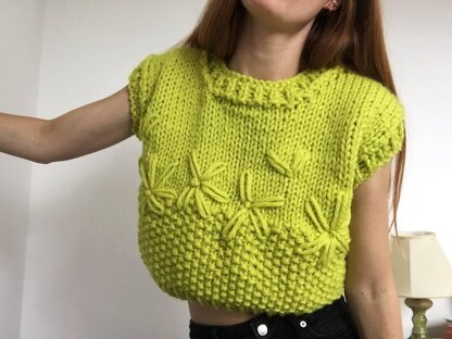 This knitting pattern is for a playful crop top mixing moss stitch and stockinette.
