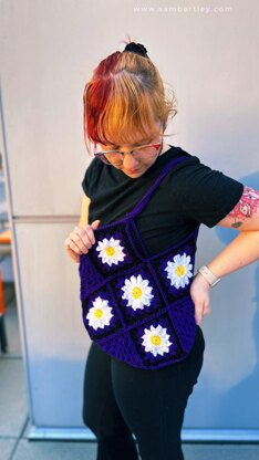 I know you’re supposed to write something clever here, or witty, or even inspiring, but I just don’t ever know what to write when describing my designs so that it doesn’t sound like a food blogger trying to use every SEO/Keyword possible. So here is my Daisy Granny Square Bag. I had originally planned on making a cardigan for my first Pride parade, because yellow, white, purple, and black are the colors of the Non-Binary flag, but after making 42 yellow circles I decided I did not want to weave in 42 squares worth of ends, so I finished 10 and called it a weekend. Also, as much as I struggled with it, the daisy is probably my favorite part because it only took 22 tries to figure it out. The temptation to just google it crossed my mind, but this time, I won. Anyw