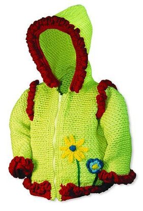 This easy to crochet Hoody is a show stopper. The single crochet variation stitch gives it great texture. The bright red ruffles give it the ahhhh factor and the whimsical flowers on front and back will stand out coming and going.