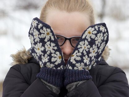 The mittens are worked in 2 colours and then a small amount of a third colour is used to duplicate stitch the middles. Instead of a third colour for the middle of the flower, you can add beads as you knit by slipping them on a crochet hook: 110 size 6/0 beads needed.