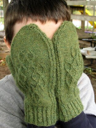 Every year for Christmas I give my mom a gift card for “anything knit.” I’ve made her lots of socks and a sweater too; this year she wanted mittens. She loaned me her Celtic ring as inspiration and chose some beautiful Alpaca yarn. The main cable pattern is based on the ring, with interlocking hearts that also remind me of flowers. My mom says she has always wanted to name something “Daisy,” so I am giving her these mittens. The cuff ribbing is a little zig-zaggy just for fun, and travels up the edges of the mittens and meets at the top in an unbroken line. Plain stockinette palms are comfortable and help speed the knitting too. Thumb gussets are worked as you go, then put aside (come back to do the thumb tip after the mitten is done). I knit the entire mitten using magic loop, but the pattern is adaptable to two circs or double-pointed needles as you prefer. I knit all the cables without a cable needle, but beginner cablers may feel more comfortable with a skinny cable needle.