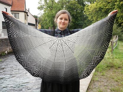 The lace details make this a light an airy shawl, with great potential for blocking when using a yarn that can be blocked to open up the lace.