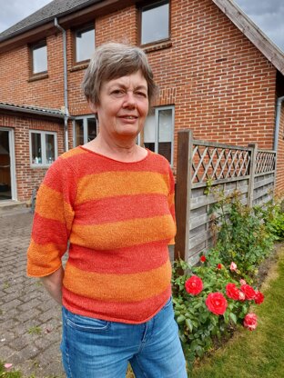 A becoming jumper with modified drop-shoulder sleeves in plain knitting in silk. The jumper is slightly fitted without being tight (optional). All edges are roll edges. To use alone or under a pullover in the winter. Accurate written pattern. The jumper is worked in rounds until armholes. But if you prefer, it can be worked flat; instructions for that are included in the pattern. Also beautiful in cotton and/or plain coloured. Required skill level from 1 (basic) to 5 (advanced): 3. The measurements given throughout the pattern are all in cm as well as inches.