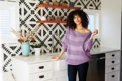 Daisy is a fashionable oversized sweater that is great for spring weather or even as a beach cover up! It features sections of simple mesh trellis lace between Stockinette Stitch, a curved hem, and dolman sleeves. The wide neckband allows for wearing off the shoulder and the relaxed fit is perfect with jeans.