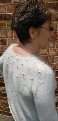 This is a very simple but elegant top down pullover with plenty of ease making it a nice, relaxed, comfortable fit. The bead work is very simple to master and adds such a fun sparkle. The applied twisted edge with an exposed 3 needle bind off creates a lovely finishing touch.