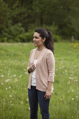 This raglan-style sweater is knit from the top down to just below the underarms. Three-quarter length sleeves are worked in the round with garter stitch cuffs. The body is worked side to side as a separate piece, shaped with short rows at the underarms, then seamed horizontally to the bottom edge of the yoke. Garter edging is worked along the hem and collar.