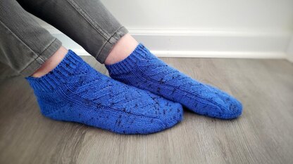 Dappled Deep socks were designed to let the beauty of speckled yarns shine. They are knit toe up, with a mini gusset leading into a shadow wrap short row heel and a fluid, lacy pattern on the instep, which is lovely but simple enough to show off your treasured speckled yarns.