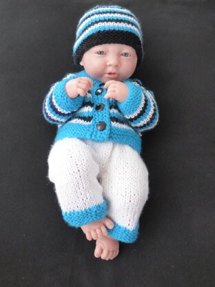 This 8ply set for a 38cm [15”] Berenguer Doll includes a Beanie, Cardigan and Pants. This three colour design will suit either a girl or boy doll.