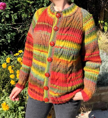 A gorgeous, cosy jacket suitable for both men and women. Comfy raglans and bold cables are set against a broken rib background pattern. The colour range in this lovely wool mix yarn varies from bright contrasts to more subtle mixes, so there's something for everyone, and makes this jacket stand out from the crowd.
