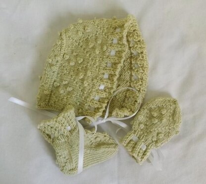 | Age: | 0-6 months | 6-12 months (mittens and booties) | newborn (bonnet) | baby (bonnet) |