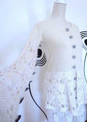 Belinda’s fulsome lace coat DARLING MOVE OVER is a tribute to the great 1940 swing singers; Peggy Lee, Anita O’day, Chris Connor. They walked on stage and dazzled us with their voices and with their poise and grace. They sparkled in those gowns. Garments, we think, should have meanings and associations. We need the warmth and grace of lives lived before us, just our shoulders seek solace. This knitted delight will do both. | A boudoir coat, a jacket that bustles with ... a bustle. A true star of the show - this coat is a one-of-a-kind piece, placing itself centre-stage. Its flowing shell-like detailing is delicate yet not fussy. The clean understated line of the bodice gentle holds the two tiered 'skirts' and the flowing abundant sleeves beautifully. This is a coat made to turn heads, a coat made to drape and flow effortlessly on your body. | ENJOY | Belinda | www.belindaharrisreid.co.uk