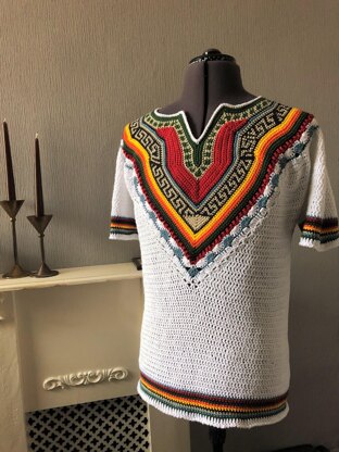Skill Level: Advanced US Crochet Terms This crochet pattern is for a classic t-shirt, with a bold, colourful neck piece and finishing. The t-shirt is made in a yoke style, by completing the neck first and working in a circle until meeting to form the arms. The design features a number of crochet design elements to create the decorative neck piece. All techniques are described in full and complex shaping is illustrated with images and charts. There is a lot of stretch in the finished item, so the sizing is only approximate. The pattern includes one size neck piece size with adjustments made in the body. I have listed this pattern as "advanced" because of shaping and pattern techniques.