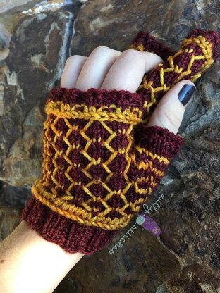 These mitts are made with her as inspiration. I chose regal colors that show off the lovely chainmail/honeycomb pattern. It looks much more difficult than it is! These mitts can easily be customized by lengthening the cuff and doing more body repeats before starting the thumb gusset.